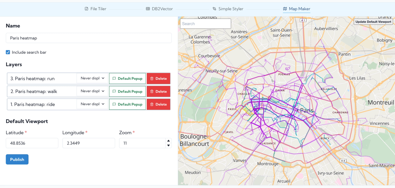 File Tiler is the first service I used in the heatmap creation process. Along with uploading my shapefile, I also configured the default viewport to be positioned at the center of Paris. I figured zoom bounds 3 to 16 were reasonable for the scope of the heatmap.